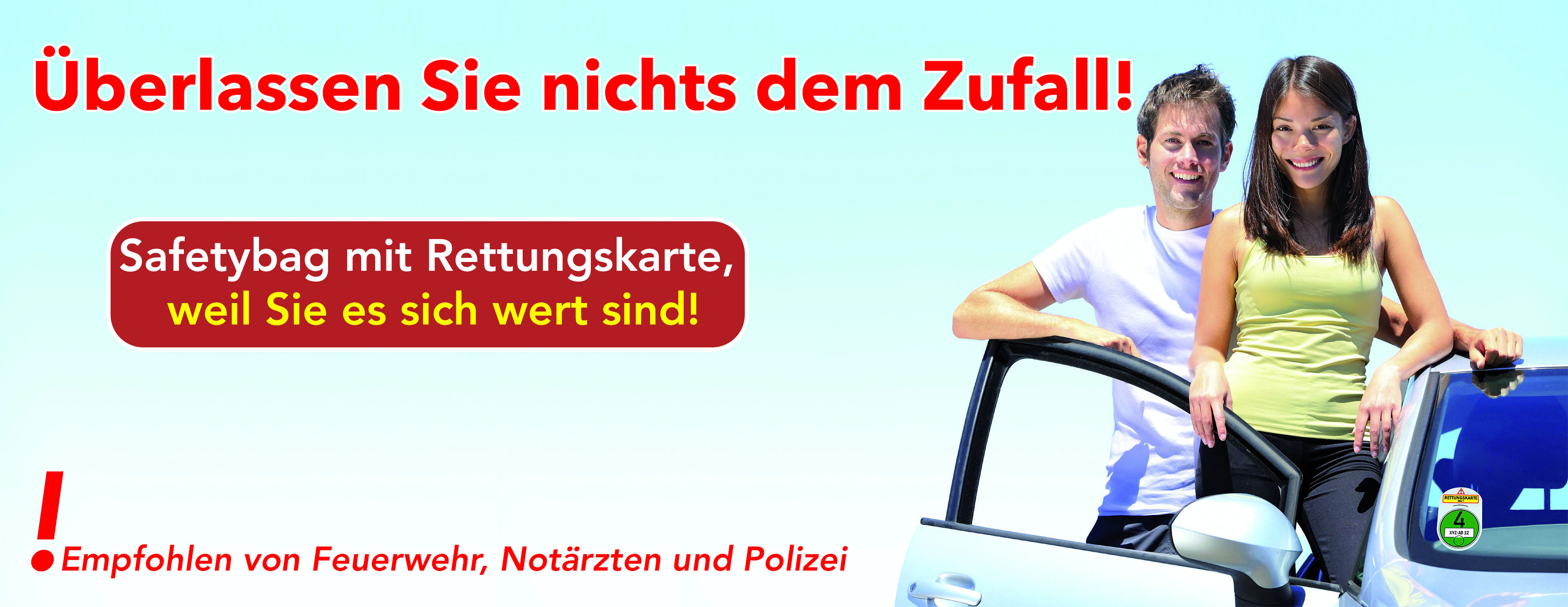 Stellungnahme bezüglich Anbringungsort: Gegen ein Anbringen des Rettungsdatenblattes (Rettungskarte) im Fahrzeug spricht insbesondere, dass z. B. nicht alle Sonnenblenden die Befestigung der Rettungskarte zulassen. Außerdem muss man die Rettungskarte erreichen können. Dazu müssen die Retter erst in den Fahrzeuginnenraum gelangen... ... Für Ihre interessanten Anregungen möchte ich mich herzlich bedanken. Wir sollten diese weiterentwickeln und soweit möglich auch sinnvoll implementieren.DIE SAFETYBAG (TASCHE FÜR DIE RETTUNGSKARTE) ERHALTEN SIE IN AUSWÄHLBAREN DESIGNS DIREKT VOM HERSTELLER.